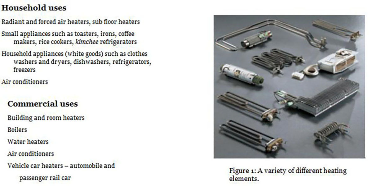 图1:各种不同的加热元件、铁路客车家用辐射式和强制式空气加热器、地板下加热器小型电器,如烤面包机、熨斗、咖啡机、电饭锅、泡菜冰箱家用电器(白色家电),如洗衣机和烘干机、洗碗机、冰箱、冰柜,空调,商业用途,建筑和房间加热器,锅炉,热水器,空调,汽车加热器。