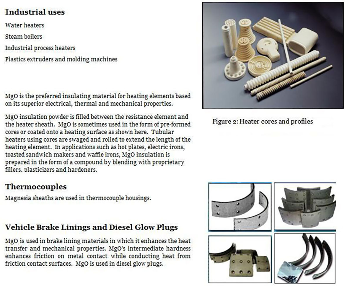 图2:加热器芯和型材,热电偶氧化镁护套用于热电偶外壳。车辆制动衬片和柴油电热塞氧化镁用于制动衬片材料,它能增强热传递和机械性能。氧化镁的中等硬度增强了金属接触的摩擦,同时从摩擦接触面传导热量。氧化镁用于柴油电热塞。